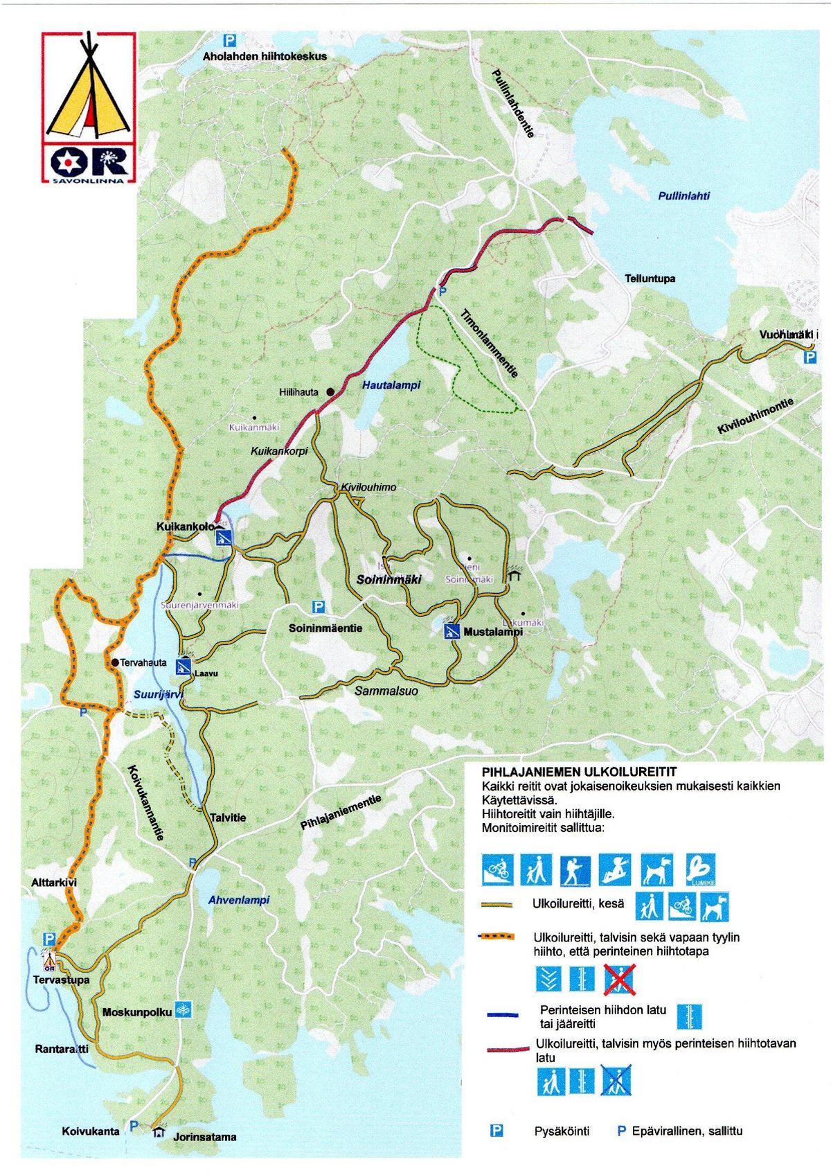 Pihlajaniemen ulkoilureitit. Kaikki reitit maastokartalla.